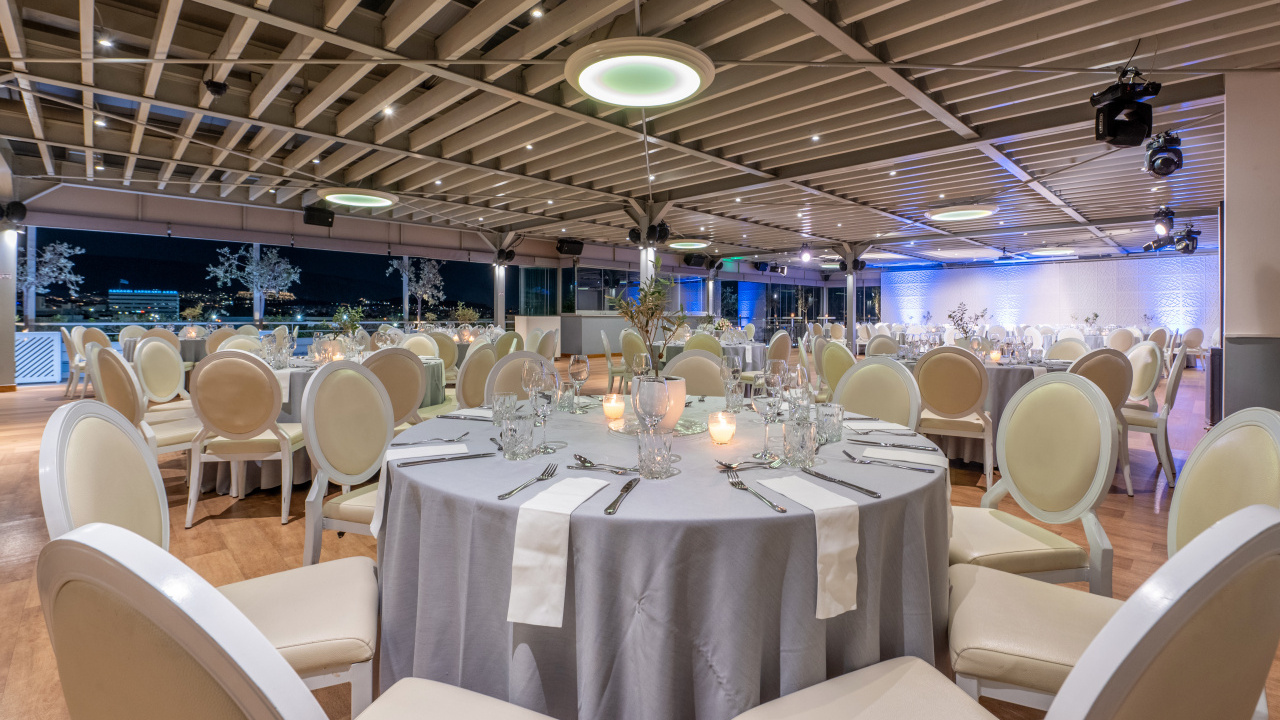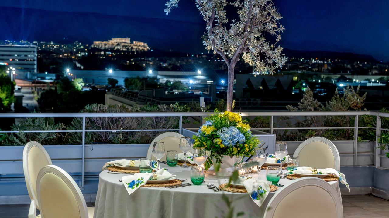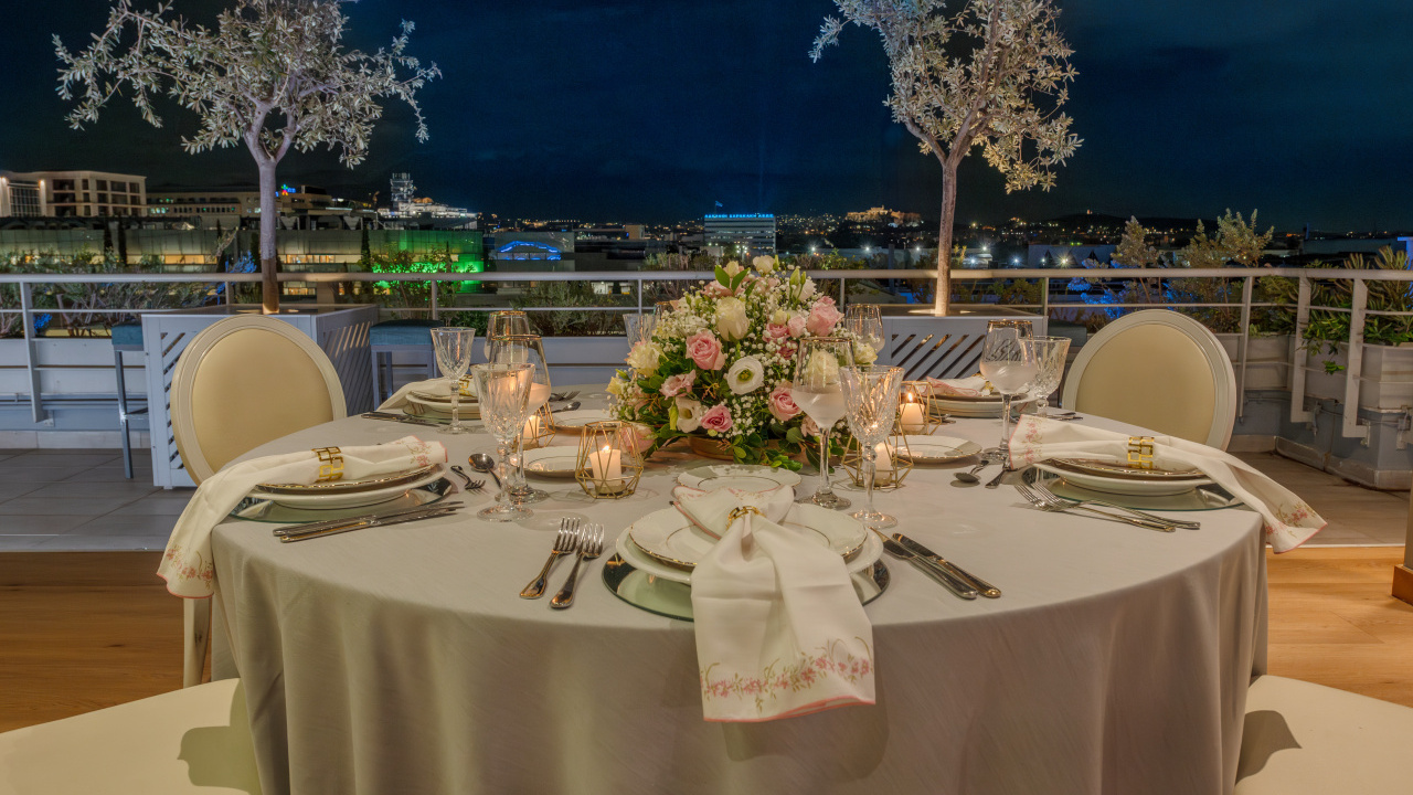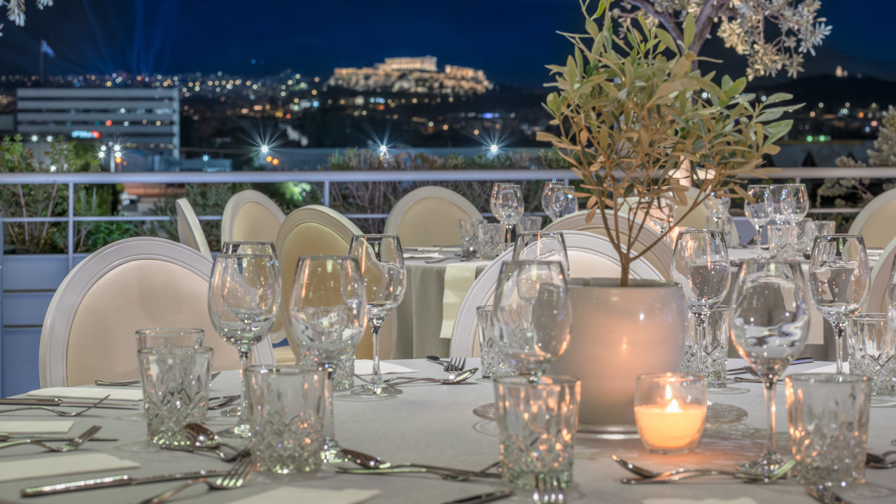 The unobstructed view to the Acropolis and the Lycabettus, generous premises, high aesthetics in its interior design, furnishings, tableware, linen, modern technological infrastructure, our selected partners in lighting, music and decoration and our workforce, welcoming, hospitable, with comprehensive training and experience, compose all the parameters that ensure the success of every event.